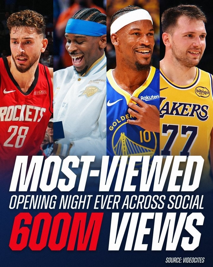 Theo thống kê, hai trận mở màn của Thunder vs. Rockets và Lakers vs. Warriors đã đạt được lượng truy cập cao nhất trong lịch sử, với lượt xem vượt quá 600 triệu lần trên tất cả các nền tảng xã hội của NBA và bên thứ ba (vẫn đang tăng lên).