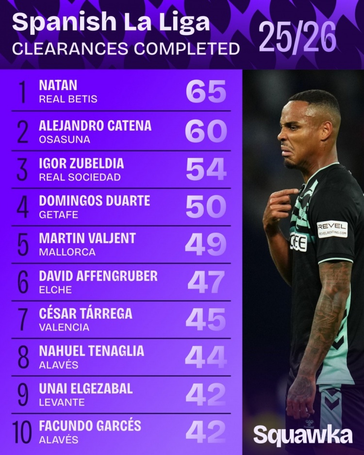 Một vài ngày trước, Squawka đã đếm số lượng giải phóng mặt bằng ở La Liga mùa này, với hậu vệ Betis Natan xếp hạng đầu tiên với 65 lần và Zuberdia thứ ba với 54 lần.