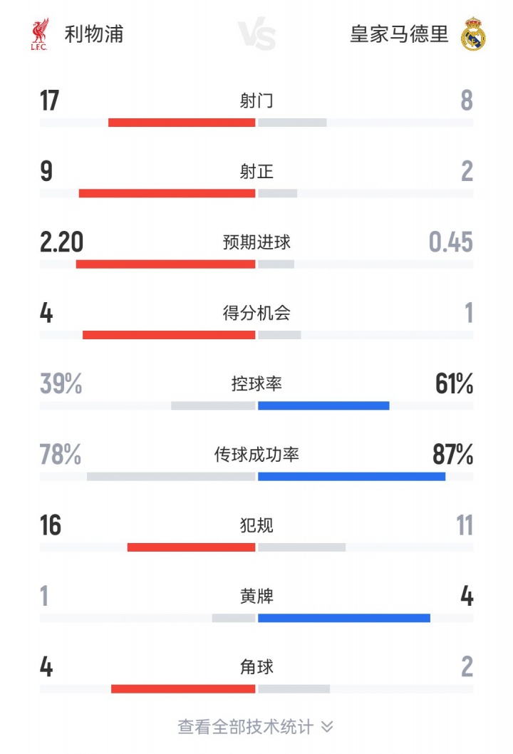 Thống kê toàn trận Liverpool 1-0 Real Madrid: Quỷ đỏ cầm bóng 40%, 17 cú sút trúng khung thành, còn Real Madrid cầm bóng 60%, 8 cú sút trúng đích và 2 bàn thắng