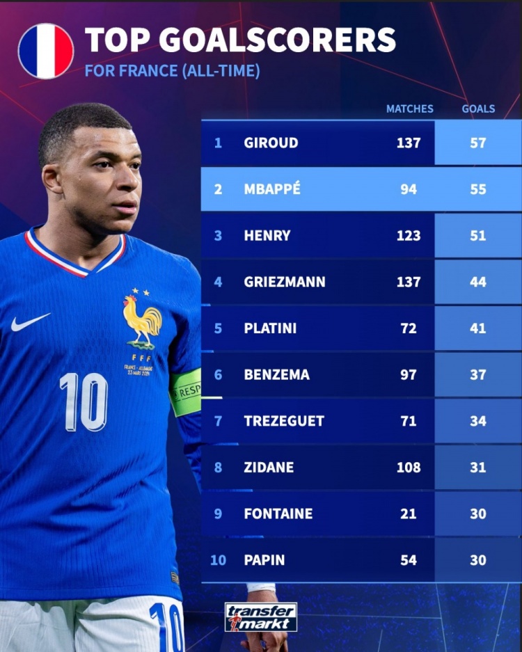 Còn 2 bàn thắng! Danh sách vua phá lưới mọi thời đại của đội tuyển Pháp: Giroud dẫn đầu danh sách với 57 bàn, tiếp theo là Mpbappe với 55 bàn