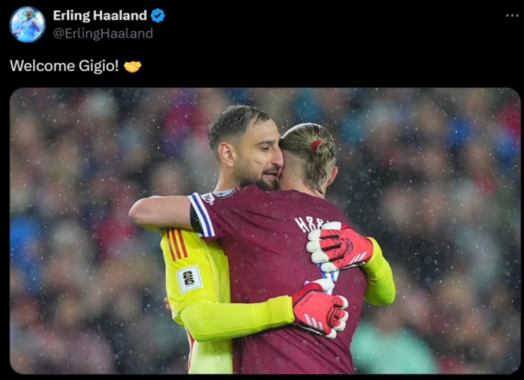Haaland cũng đã đăng một bức ảnh anh ấy ôm Donaruma qua phương tiện truyền thông xã hội và nồng nhiệt chào đón người chơi mới mạnh mẽ: "Chào mừng, Gigio (biệt danh của Gianluigi)!"