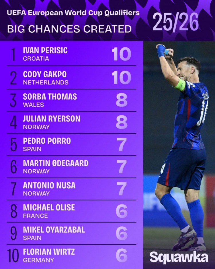 Vòng bảng vòng loại Châu Âu Thế giới này đã kết thúc. Squakwa cũng tính đến những cơ hội lớn được tạo ra ở giải đấu này. Perisic và Gakpo đồng hạng ở vị trí đầu bảng.