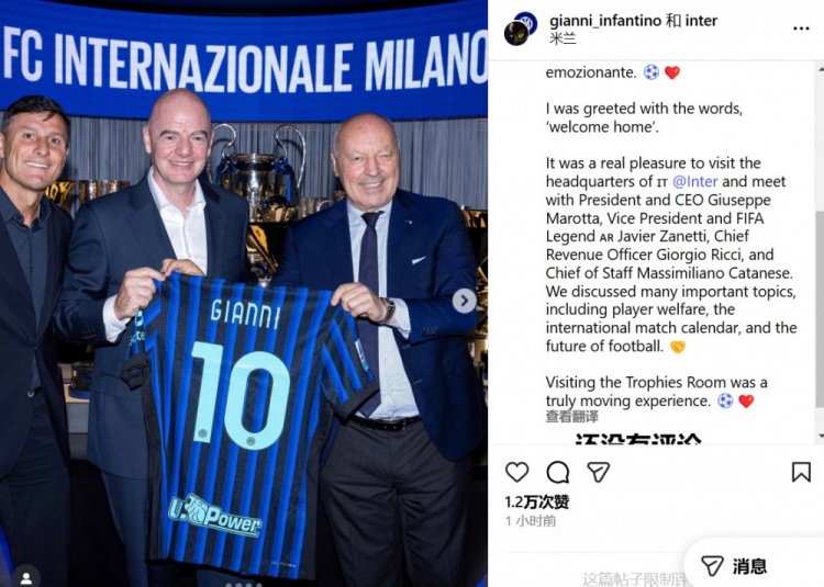 Infantino đã viết: Kinh nghiệm của tôi lần này có thể được mô tả là "về nhà". Rất vinh dự khi đến thăm trụ sở của Inter Milan và gặp Giám đốc điều hành Club Marlotta, phó chủ tịch và huyền thoại bóng đá quốc tế Zanetti, giám đốc doanh thu George Richi và giám đốc điều hành Maximiriano Catanese. Chúng tôi đã thảo luận về nhiều chủ đề quan trọng, bao gồm sức khỏe của người chơi, lịch trình trận đấu quốc tế và tương lai của bóng đá. Tham quan phòng danh dự câu lạc bộ là một trải nghiệm cảm động sâu sắc!