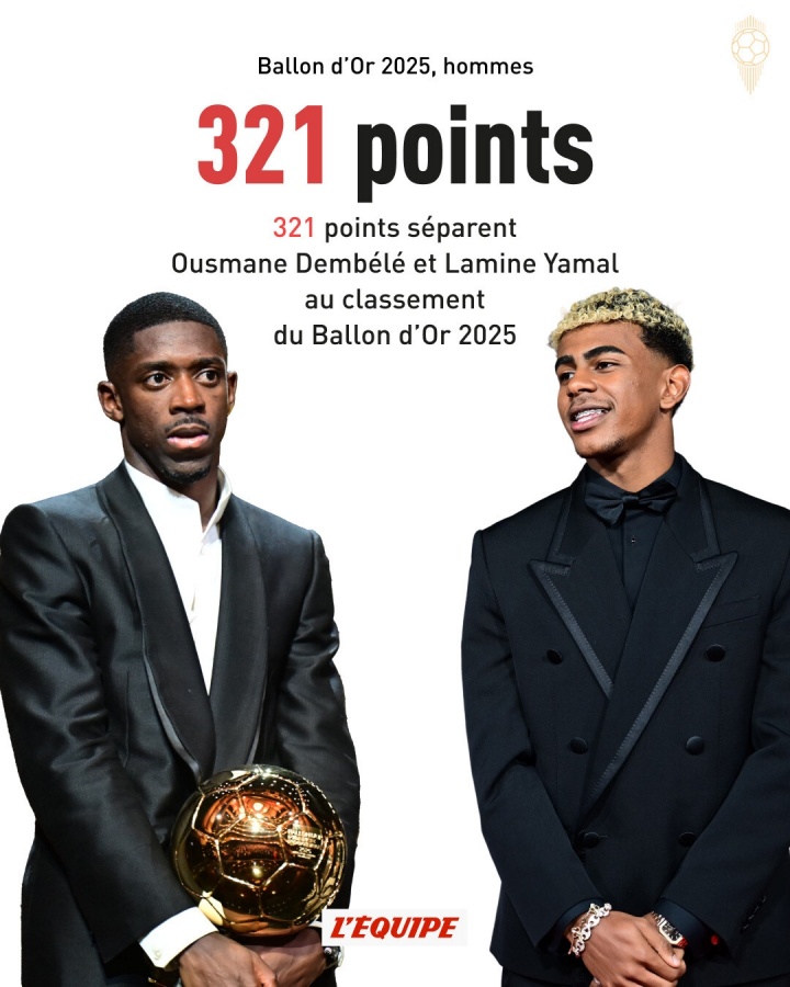 Sự khác biệt về điểm chiến thắng trong Giải thưởng Quả cầu vàng trong 10 năm qua: Khoảng cách lớn nhất của Dembele trong 3 năm qua, 7 điểm vào năm 2019, 41 điểm vào năm 2024